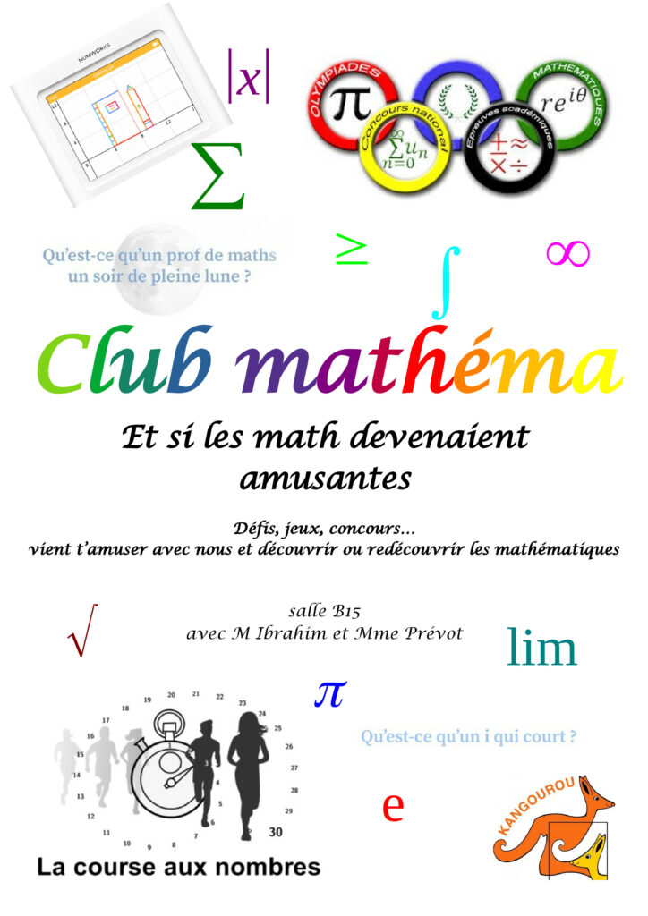 Durant les heures du club mathéma, les élèves se préparent aux divers concours (course au nombres, kangourou, olympiades) et actions qui sont faites durant l’année autour des mathématiques. Ils pratiquent également les mathématiques de manière plus ludique via des jeux ou des énigmes.